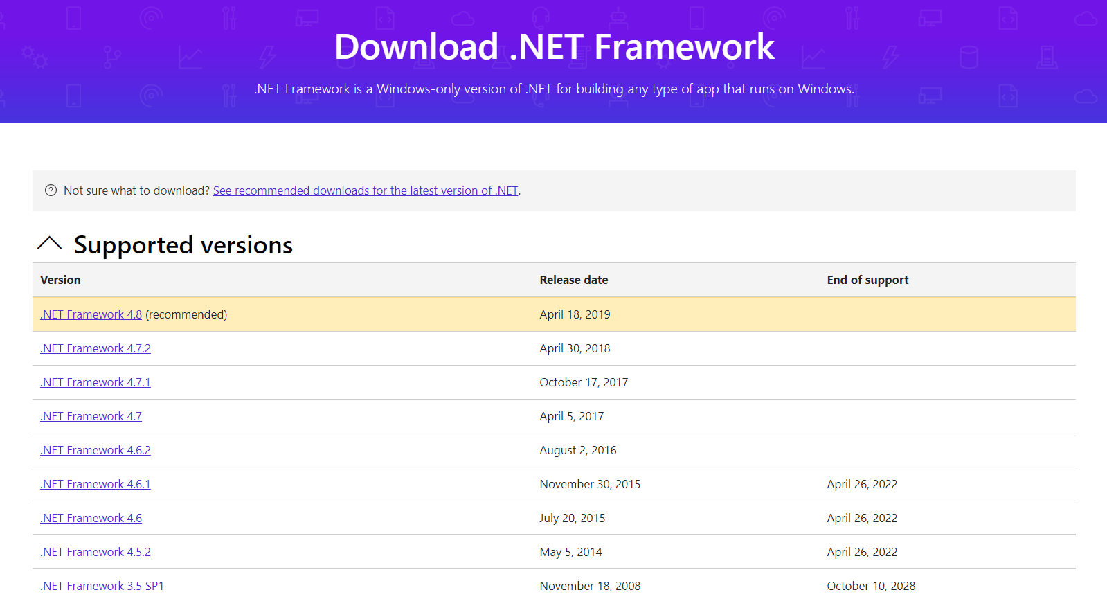 過去バージョンは Microsoft 公式の Download .NET Framework から確認し、インストールすることも可能です。