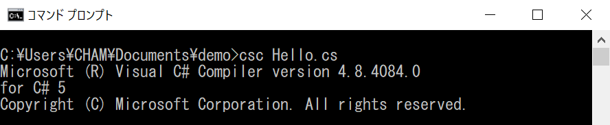 コマンドプロンプトを起動して、Hello.cs が存在するディレクトリに移動します。