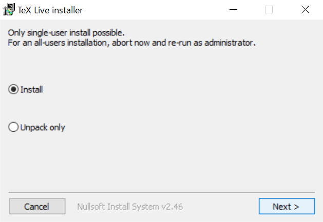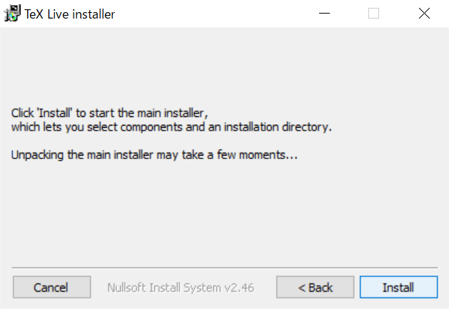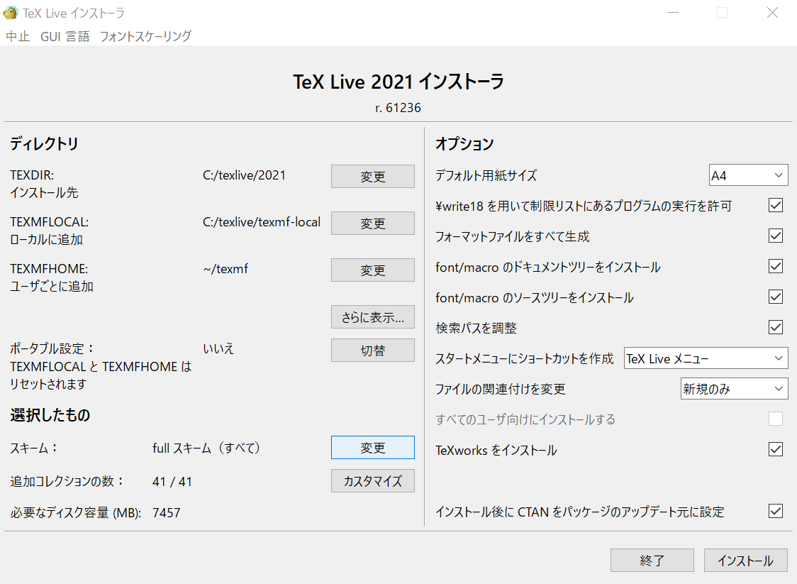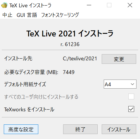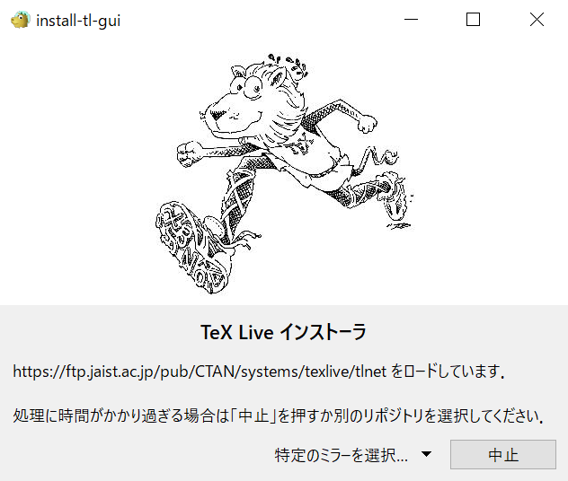 をクリック- ダウンロードした「install-tl-windows.exe」をダブルクリックして実行