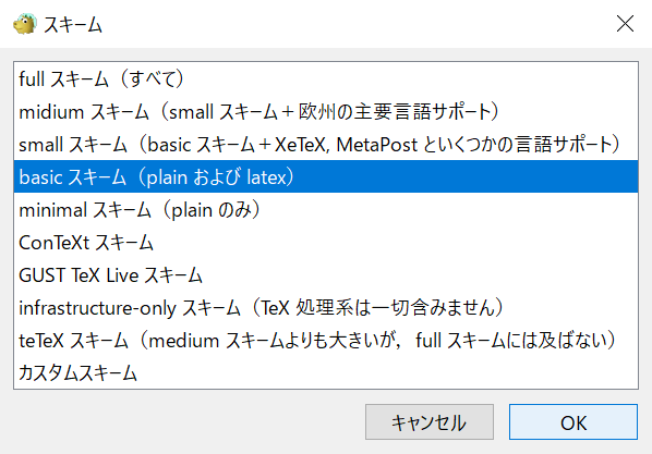 - 「basic スキーム(plain および latex)」を選択して OK をクリック