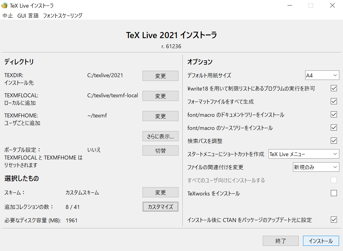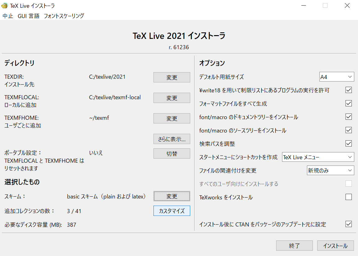 選択したもの | インストールするスキーム(パッケージセットの規模と用途)や、コレクション(パッケージ、拡張機能、フォント)の設定 |