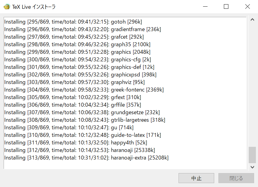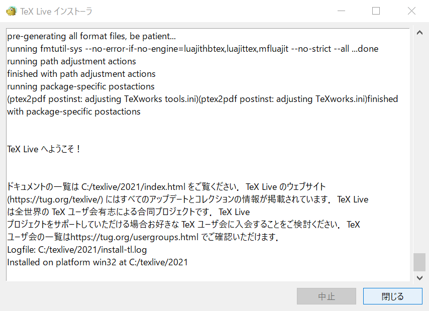 インストールの完了を確認のうえ、「TeX Live インストーラ」の閉じるをクリックします。