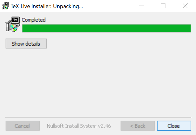 最初に展開した「TeX Live Installer」についても、Closeをクリックします。