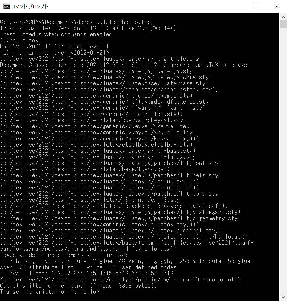 コマンドプロンプトを起動して、hello.tex が存在するディレクトリに移動します。