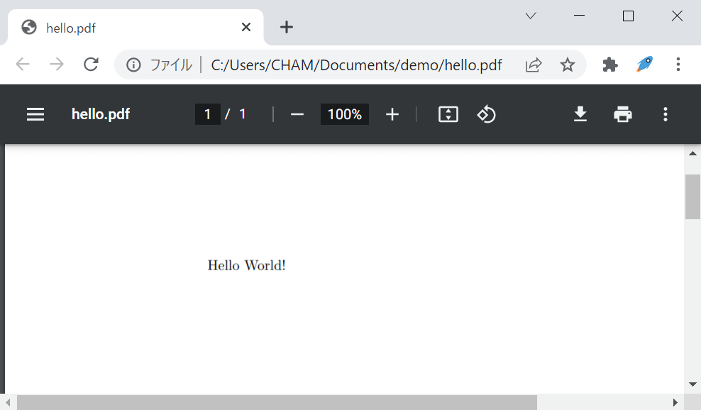 簡単なサンプルとして、お馴染みの挨拶を記載した PDF を作成します。