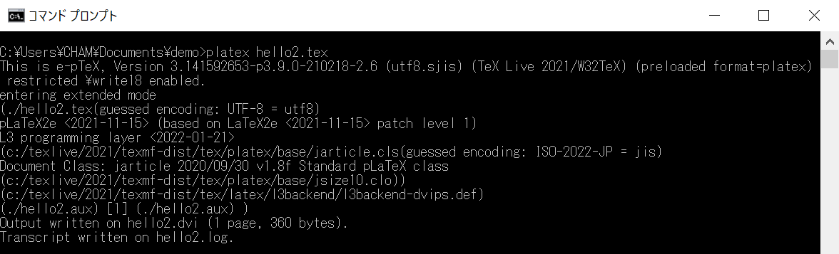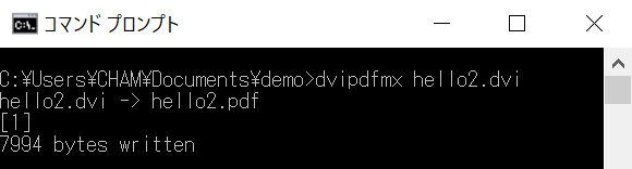 コマンドプロンプトを起動して、hello2.tex が存在するディレクトリに移動します。