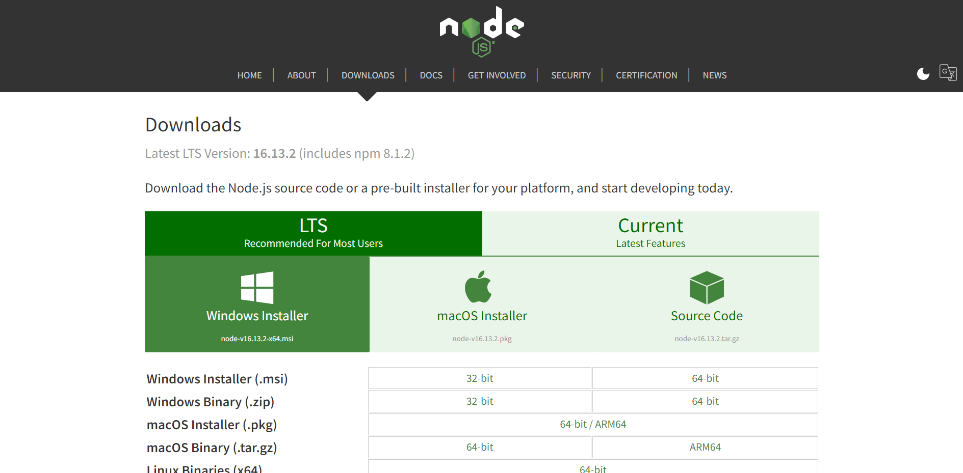 ここでは、最新版ではなく、機能保証やバグ修正のサポートが長く安定している LTS(Long Term Support)のインストーラを使用します。
