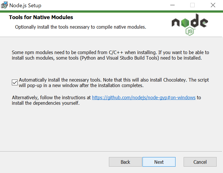 ここでチェックしない場合も、後から GitHub の node-gyp を参照のうえ設定可能です。