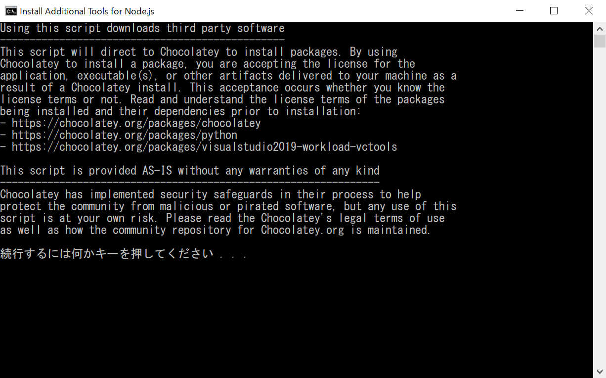 オプションをチェックすることで、Node.js のインストール完了後、コマンドプロンプトにおいてネイティブモジュール用ツールのセットアップスクリプトが起動し、必要なツールのインストールも併せて行われます。(STEP.7)
