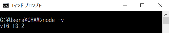 コマンドプロンプトに下記コマンドを入力し、インストールした Node.js バージョンが表示されれば、正常にセットアップされています。