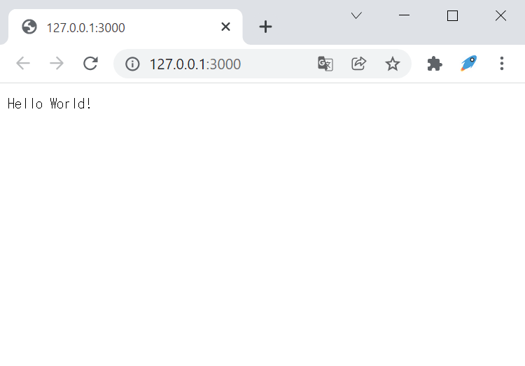 hello.js をコマンドプロンプトで実行し、http://127.0.0.1:3000/ にアクセスすると、ブラウザに「Hello World!」が表示されます。