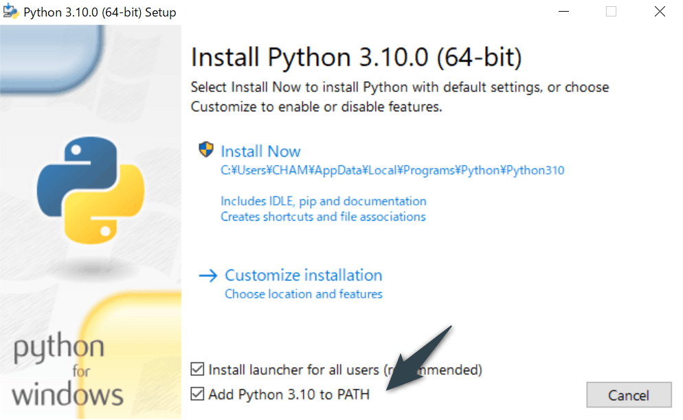 - ダウンロードした「python-3.10.0-amd64.exe」をダブルクリックして実行