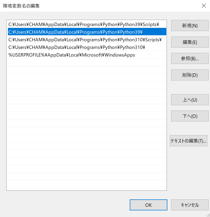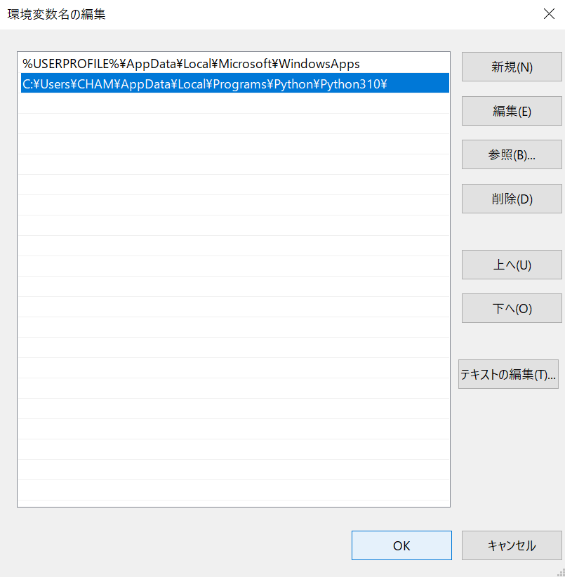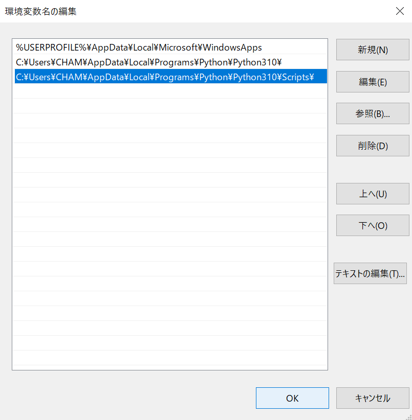 %USERPROFILE%\AppData\Local\Programs\Python\Python310を登録%USERPROFILE%\AppData\Local\Programs\Python\Python310\Scriptsを同様に登録- 上へをクリックして2つのパスの優先順位を変更(