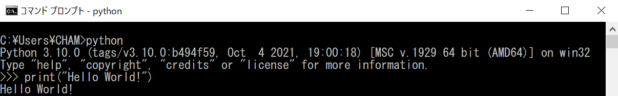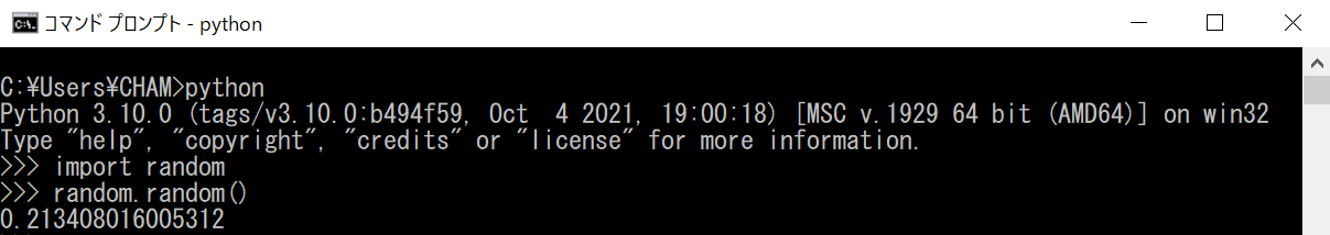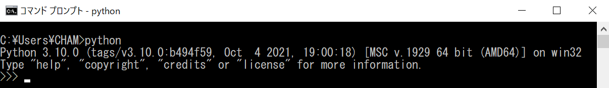 コマンドプロンプトにpythonと入力することで、インタプリタを起動します。