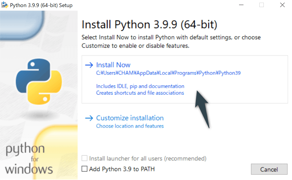 - ダウンロードした「python-3.9.9-amd64.exe」をダブルクリックして実行