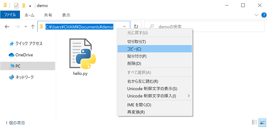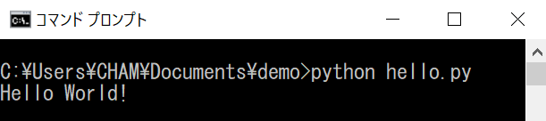 コマンドプロンプトを起動して、hello.py が存在するディレクトリに移動します。
