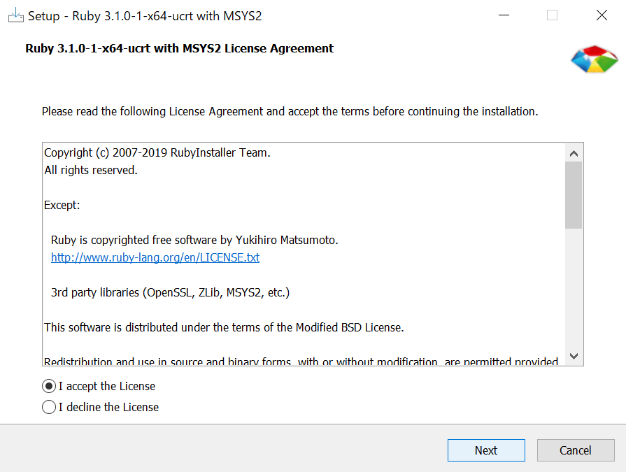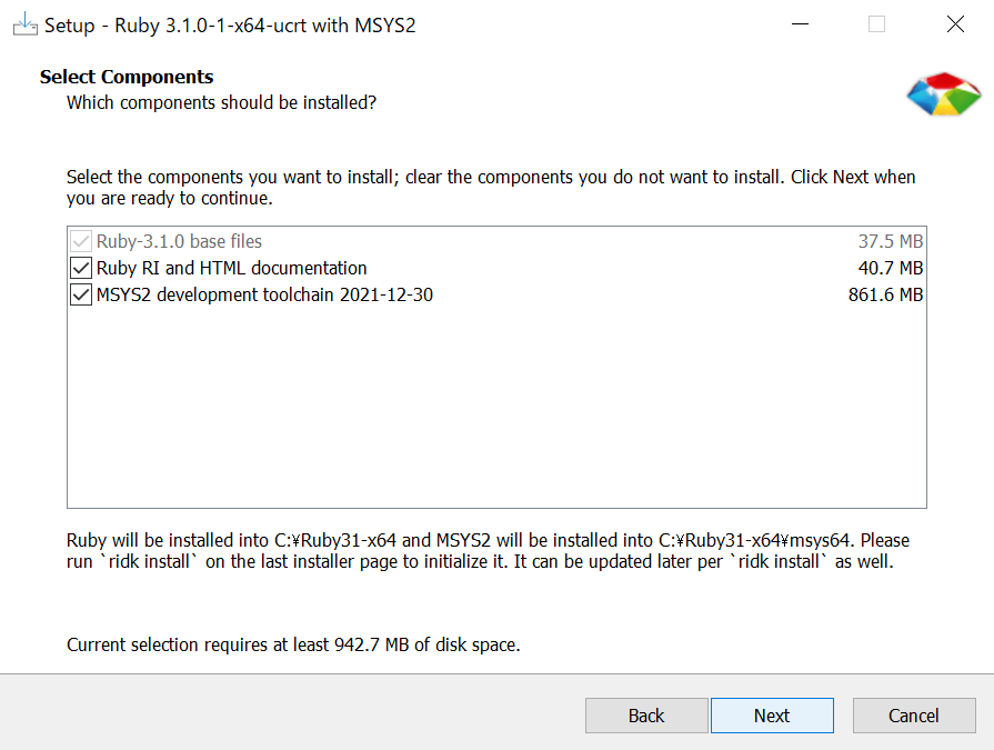 Ruby のインストールの完了後、続いて MSYS2 開発ツールセットのセットアップを開始します。