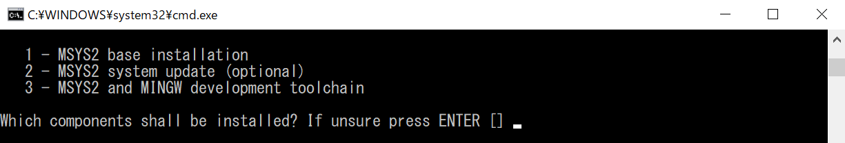 コマンドプロンプトにて「RubyInstaller2 for Windows」が起動します。