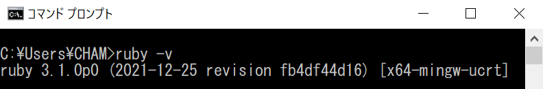 コマンドプロンプトに下記コマンドを入力し、インストールした Ruby バージョンが表示されれば、正常にセットアップされています。